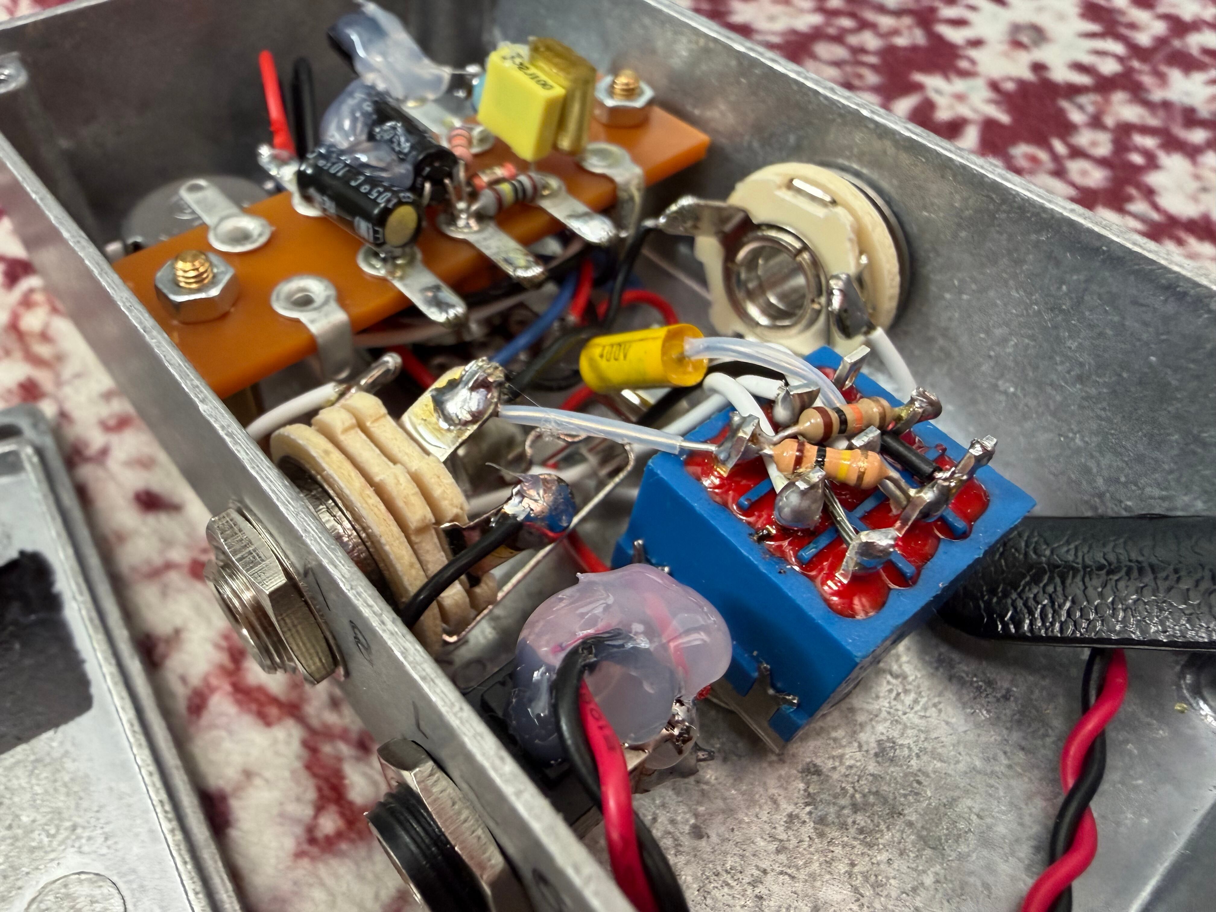 オリジナルのレンジマスターはPNP型ゲルマニウムトランジスタを使用していたため、パワーサプライによる電源供給ができませんでしたが、当アイテムはNPN型トランジスタを使用しているためパワーサプライの使用が可能です。